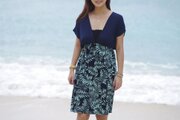 夏の新作!リーフ柄Vネックワンピース <ネイビーミント>