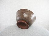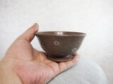 硬い手触りの陶器・赤土のご飯茶碗.白梅模様を描きました.成人男性にも十分なしっかりサイズで,「やや大」というところかと思います.