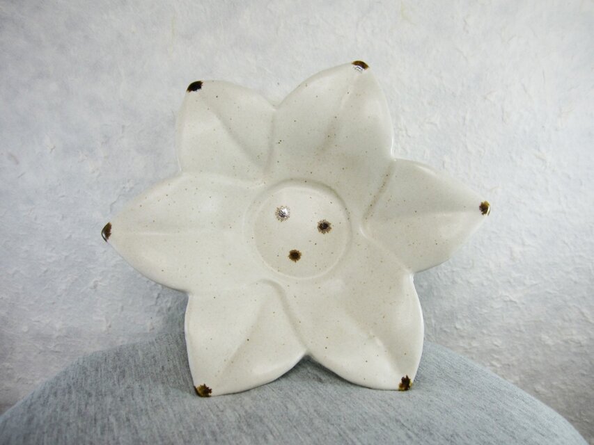 自作の型で抜いた変わり皿,とある美術館所蔵の向付を模して作ってみたものです.少し茶色のつぶつぶが混ざった白いマット状の釉薬に,茶色のポイントを施しました.