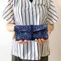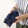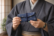 その技術を生かし、現在の日常で長く使っていただけるように素材はデニムを選び、銀泥で麻の葉紋様を金彩加工しました道中財布です。