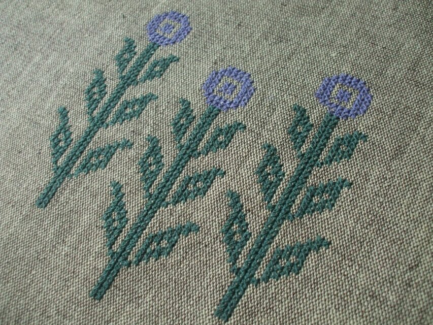 生成りと茶の綿麻生地に花刺繍しました。