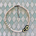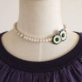 【素材】セルロイド製フランスヴィンテージボタン28mm、リバーストーン6mm、グリーンガーネット4mm、ラブラドライト(しずく型)、チェコガラスビーズ4mm、真鍮メッキ加工