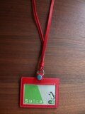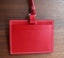 鮮やかな赤のヌメ革を使った、IDカードホルダーとストラップのセットです。
