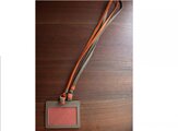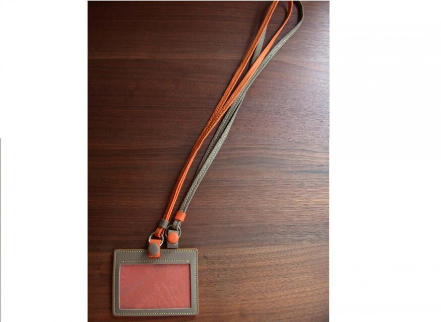 鮮やかなオレンジと落ち着いたグレーのシュリンクレザーを使った、IDカードホルダーとストラップのセットです。