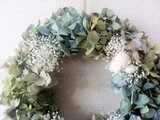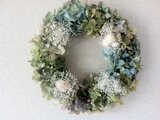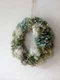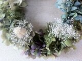 趣きのある秋色あじさいと、ブリザーブドフラワーのかすみ草、ポアプランツのシンプルでボリュームのあるリースです。