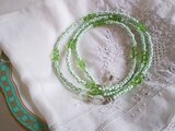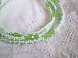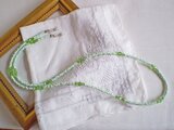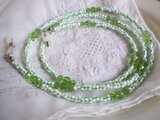 新緑の頃をイメージした眼鏡チェーンです。縦にグリーンのラインが入ったビーズ、そしてスワロフスキークリスタルのペリドットを等間隔で繋いだステーションタイプになります。