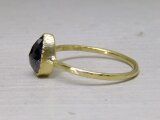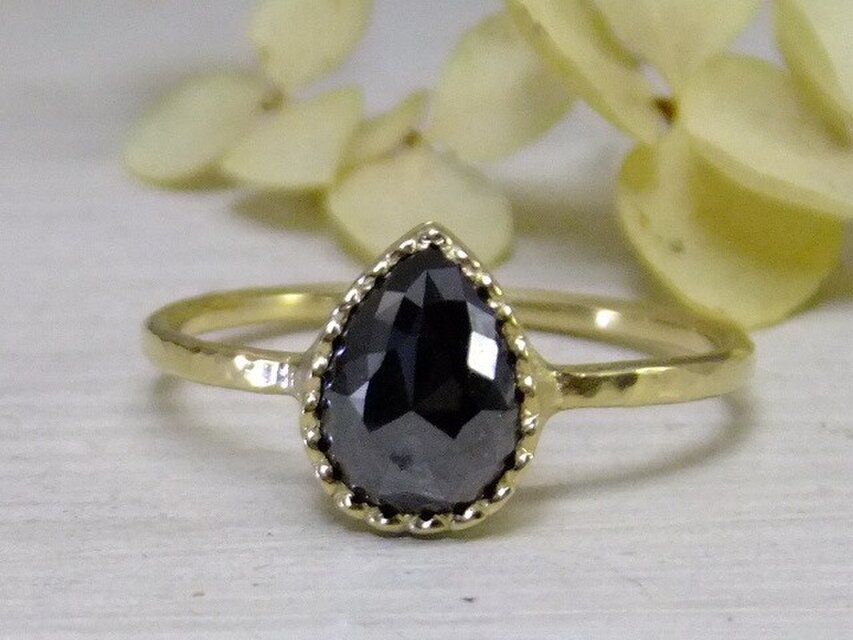 『漆黒の世界』不透明でありながらも無限の奥行きを感じるような強いテリが魅力のblackdiamond**より緻密に煌めく丁寧に施されたスーパーローズカットのペアシェイプブラックダイヤを色味が似合うK18リングにしました*1.86ctの上質大粒ルースをアンティークジュエリーによく見られるミルグレインにて石留めしリングは鎚目仕上げを施しました*8~18号(推奨サイズ)の範囲を目安に調整可能です*