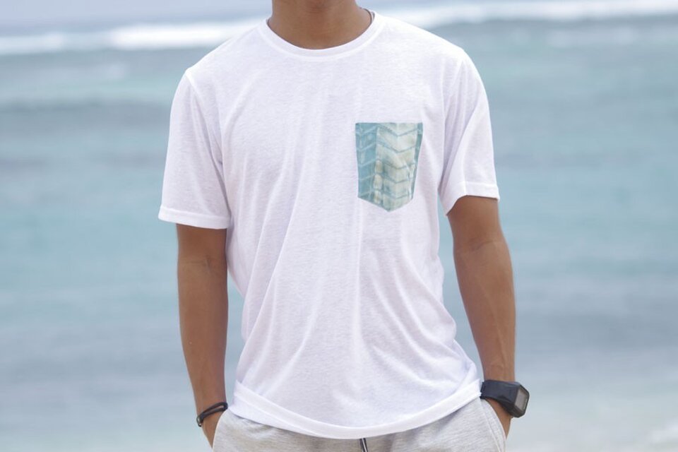 シンプルな白TシャツにBlue Watersオリジナルタイダイをポケットに使用しました。