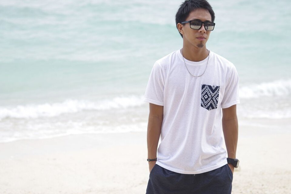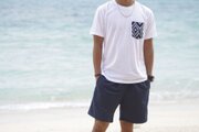 シンプルな白TシャツにBlue Watersオリジナルファブリックのイカット柄を