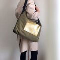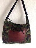 一方はカーキ色ナイロンにゴールド箔加工牛革のポケット、反対側面はカモフラージュ柄にタンニン鞣し牛革をポケットにしています。