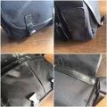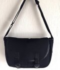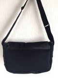 黒のコーデュラナイロンにイタリアンレザーの黒をふちどりなどに使ったふた付きショルダーバックです。シートベルト風のショルダー紐が柔らかくしっかりしているので肩にくいこみません。プラ金具の着脱はワンタッチでできます。