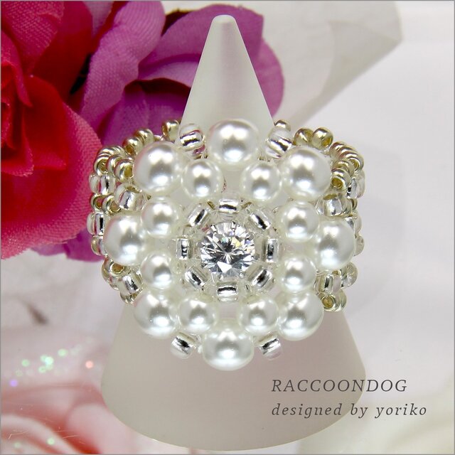 (一点物)大輪の花ピュアホワイトパールリング【チェコパールとジルコニアのビーズリング】 《ビーズアクセサリー》
