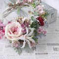 存在感のあるアーティフィシャルフラワーのガーデンローズにパープル系のライラックの花や実を散りばめ色合いは落ち着いていますが、華やかさのあるリースとなりました。