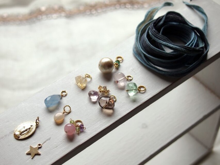 シルクリボン・天然石チャーム・チャームの3点セットです。