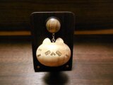 ポッチの部分(ピンズ部分)は神代ニレ(表の木)&アフリカンブラックウッド(後ろの木)の間にパープルハートのラインが入るように寄木し、ぶら下がったネコ部分はタモ源平材の縮み杢を使いました。