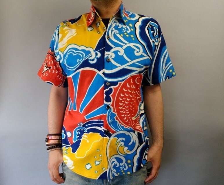 織地のしっかりした生地にド派手にめで鯛柄が描かれた粋なシャツ