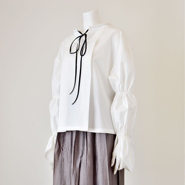 袖は肘位置と手首位置にリボンループを配置し、お好みのギャザー感で絞れるようにしてあります。