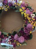 素材は全てドライフラワー。ミニバラ、千日紅、ピンクペッパー、ミモザ、木の実他。