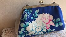 がまぐちバッグ・角型口金 青地花柄×紺レース