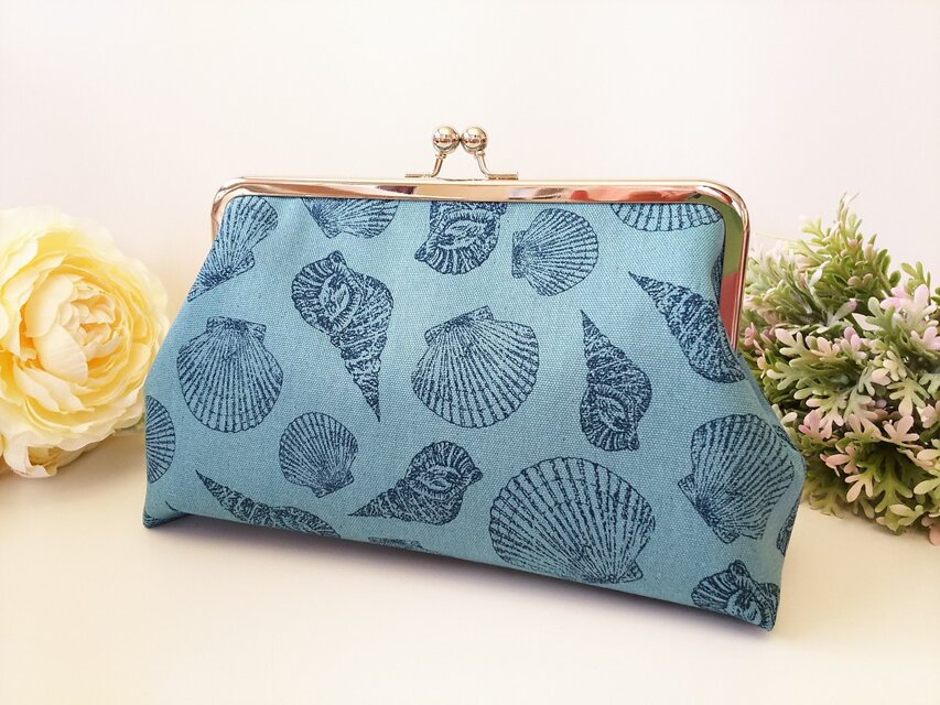 ◆【売り切れ】【再販2】スタイリッシュなシェル柄がま口ポーチ*ブルー*大人女子*プレゼントや旅行にも◆