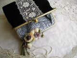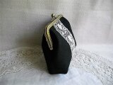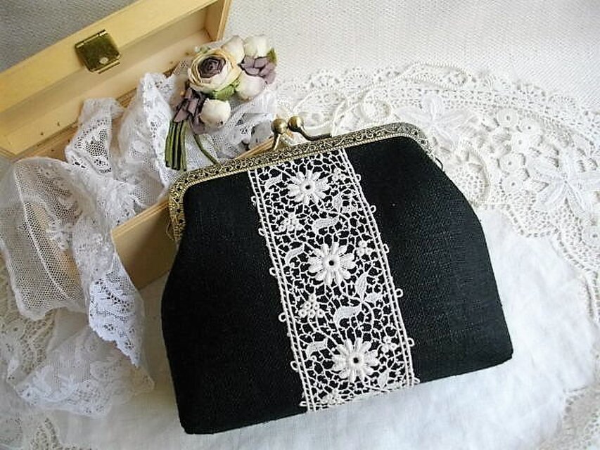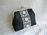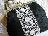黒リネンにアンティークギュピールレースをのせたがま口ポーチ