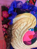 ベースの生地は大柄のお花柄、フリルの部分はラメブルーのお花レースとゴールドの生地の2種類。