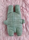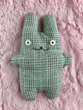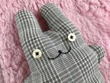 作品の特徴→目がボタンになっています。ハギレや古着を使って作っています。