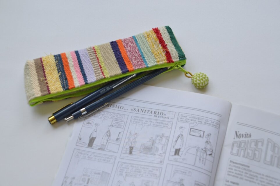 ファンシーヤーンやラメ糸等も使用したむしろ織のペンケースです。