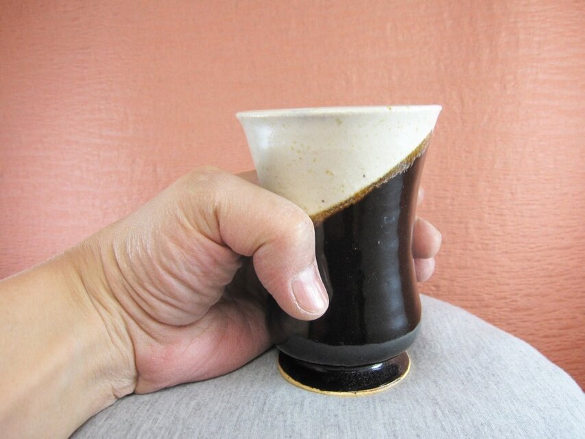 陶器のゴブレット(タンブラー?),朝顔型(再販)です.藁白釉(白)と天目釉(黒)を合わせました.