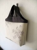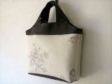かすれ具合がなんともシャビーシックなバラ柄のプリントとダークブラウンに近いシックなパープルリネンの大人のトートバッグ