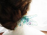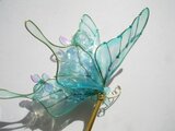 紫陽花に恋をしたアゲハ蝶,羽に紫陽花を纏ってひらひらと自慢げに飛び回っています。そんなイメージで作ったディップアートの作品です。大き目の蝶は全長約11cmあり,光に当たるとラインストーンがキラキラと輝きます。浴衣やドレスの装いにいかがでしょうか?