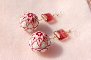 オフホワイトの手毬地に、赤い太陽のような花模様をかがりました。 レトロ調のRedビーズと合わせて。