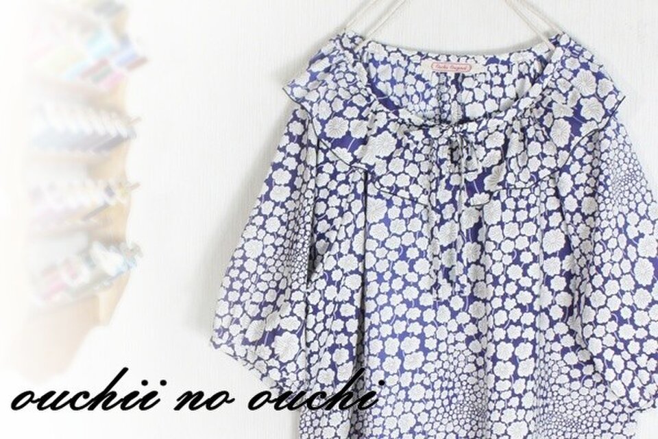 リバティタナローン人気柄<Grand Royall>(グランドロイオール)で巻きロック仕上げのフリル襟リボンラグランブラウスを作りました。