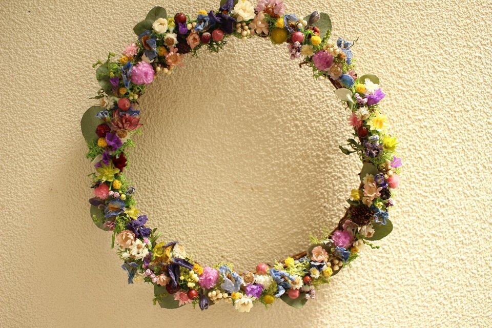 一つ一つのお花を眺めると小さな世界が広がるそんなリースです。