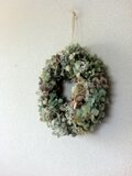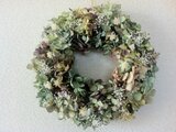 趣きのある秋色あじさいと、ブリザーブドフラワーのかすみ草、ミニコーンのシンプルでボリュームのあるリースです。
