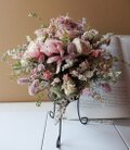 アネモネ、ラナンキュラス、タタリカ、サマーチェリー、ちどり草、スターフラワー、マウンテンミントなど。ドライフラワーならではの雰囲気をお楽しみいただけるアイアン脚付きバスケットアレンジメントです。