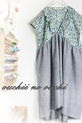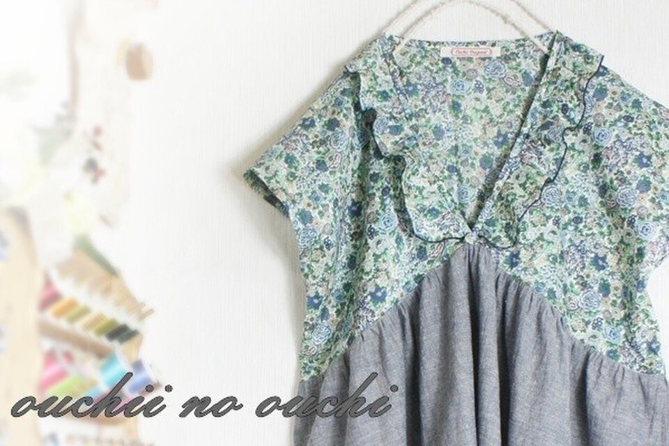 輸入リバティの大人気柄Elysianエリジアン グリーンと綿麻ハーフダンガリーリネンで巻きロックフリル後ろ下がりのVギャザーワンピをお作りしました。