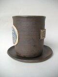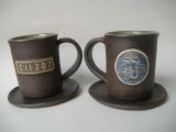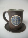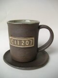 「マグカップSL C11207」は、鉄分の多い赤土と鉄分の少ない並土をブレンドし、ロクロ成形した本体に、ハンドル、11207プレート、ヘッドマークを付け、灰釉を掛け1240度で焼き上げ、煙で燻して赤黒い色を出しています。