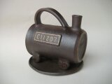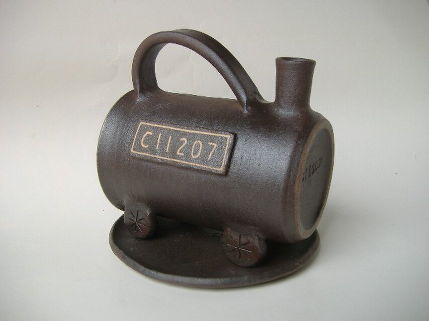 「ビアジョッキSL C11207」は、鉄分の多い赤土と鉄分の少ない並土をブレンドし、ロクロ成形した本体に煙突と車輪、ハンドル、11207象嵌プレートを付け、灰釉を掛け1240度で焼き上げ、煙で燻して赤黒い色を出しています。