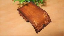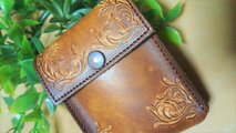 ヌメ革に唐草模様のフリーハンドナイフカービングを施した後、アンティークに手染めしています 。