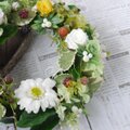 さまざまなグリーンリーフをベースにしたリースにこれから熟していくベリーの実を散りばめました。プリザーブドの白いガーベラとバラ、ベースのグリーンリーフが初夏のさわやかな雰囲気を感じさせます。