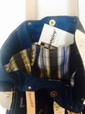 持ち手/白本革 左サイド/ベージュ本革 正面/シルバーボタン&星ワッペン(海外買い付け)各面/生成りウォッシュ加工倉敷帆布 内面/グレー&青チェック柄 綿・ポケット1個・マグネットホック※アンティークゴールドカシメ・リベット・多色使い糸・ロゴマーク等は全体のイメージに合わせてプラス