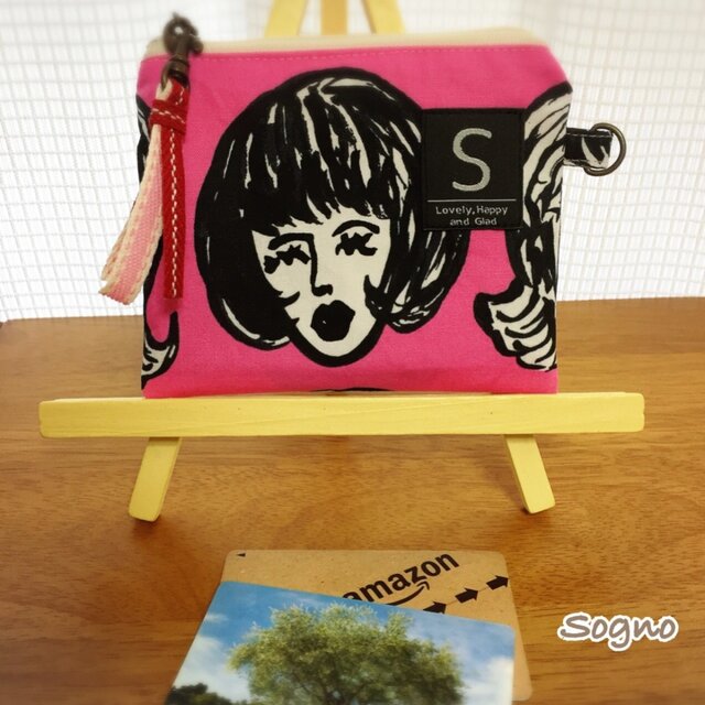 濃いピンクに沢山の顔!!とっても目にひくこの生地は、一目惚れでした。派手に見えるからシンプルな装飾で、普段使いしやすいように仕上げました。サイドにDカンを付け、工夫次第でまた違うオリジナリティーを出せる仕様です。「S」のイニシャルタグは「Sogno」のSという意味で縫い付けました。
