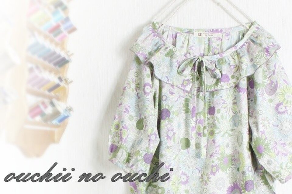 リバティタナローン大人気柄Small Susanna スモール・スザンナ で巻きロック仕上げのフリル襟リボンラグランブラウスを作りました。