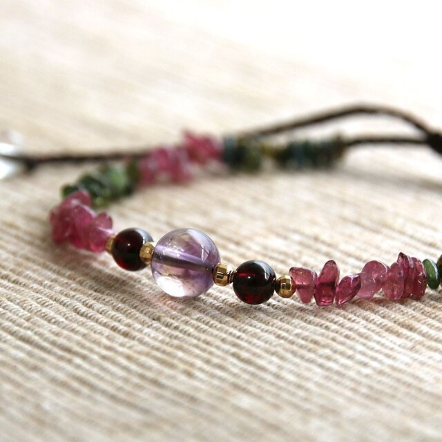 細身のアンクレットですが、透明感のあるピンクとグリーンのトルマリンが綺麗で、