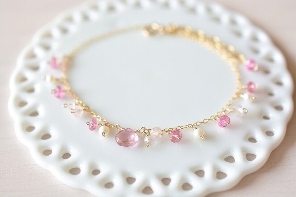 チェーンには、ピンクトルマリンやローズクォーツ、淡水パールで彩りを。