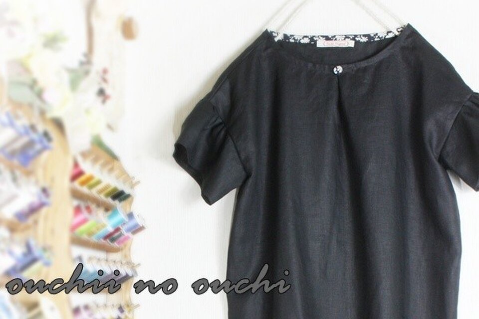 柔らかくしなやかなしっとりしたブラックのリネン100でお作りしましたラッフルスリーブワンピースです。