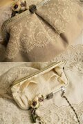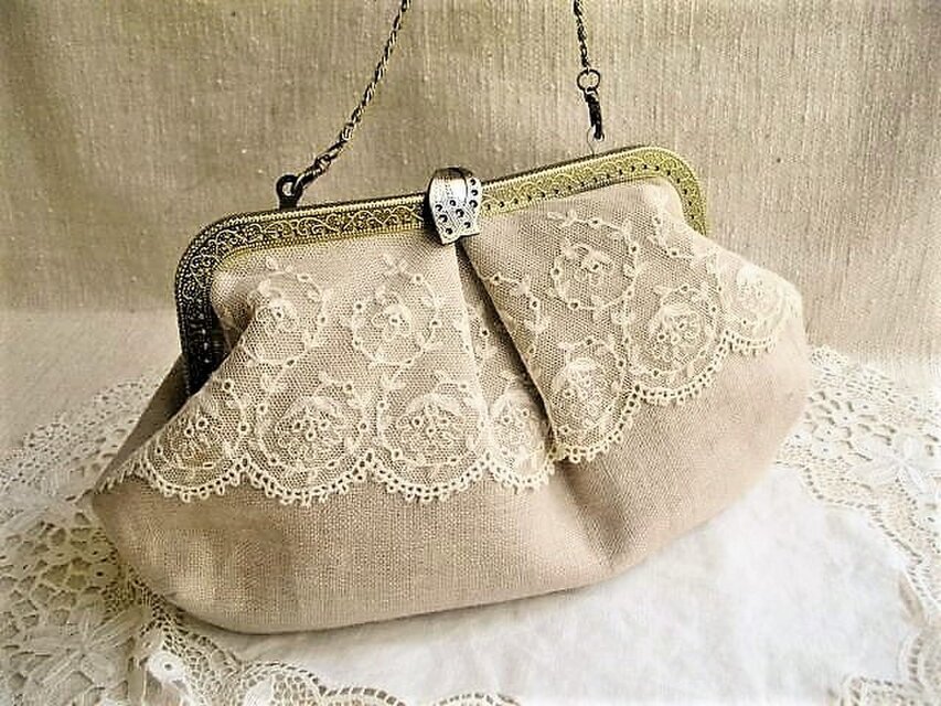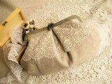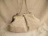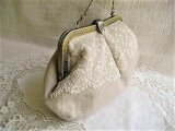 エクリュ(淡いベージュ)リネンにアンティークレースをのせたがま口バッグ