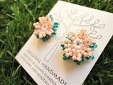 ビーズを使って可愛さと大人の女性らしさが同時に存在するような印象のピアスを作りました。きらめき堂のビーズでできたラリエットに使うお花モチーフと同じものです。セットで身に着けて頂いてもお似合いかと思います。