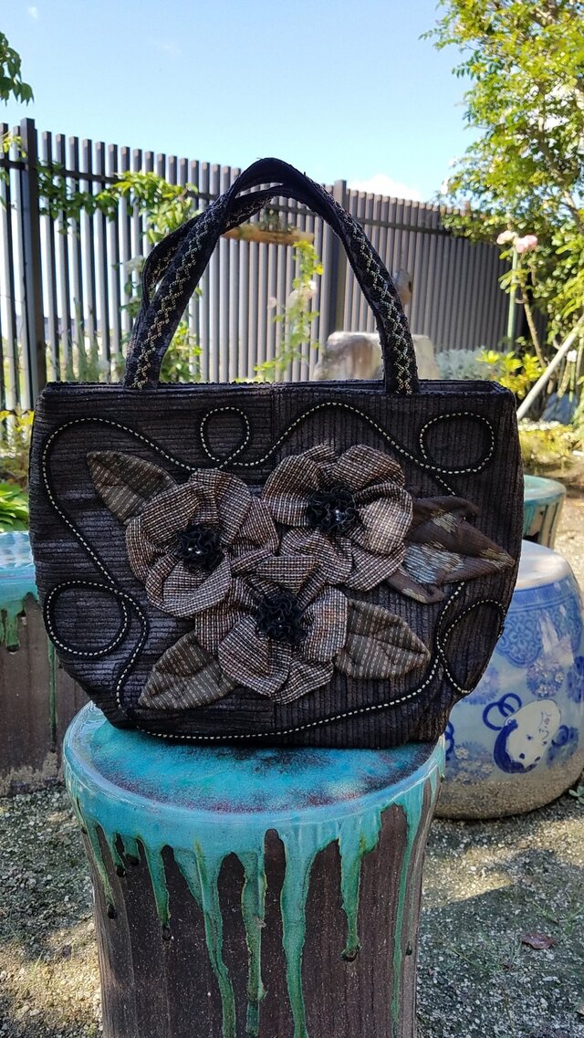 ジャム染めの本体に大島でかわいらしくお花と葉っぱをつけました。